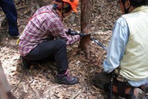 ヒノキの人工林の簡単な調査、分析 空開け体験(手ノコによる伐倒 3本) 2.授業展開の検討 (13:00~15:00) 学校環境学習プログラムとしての展開の可能性、手法の工夫、質疑応答等 |