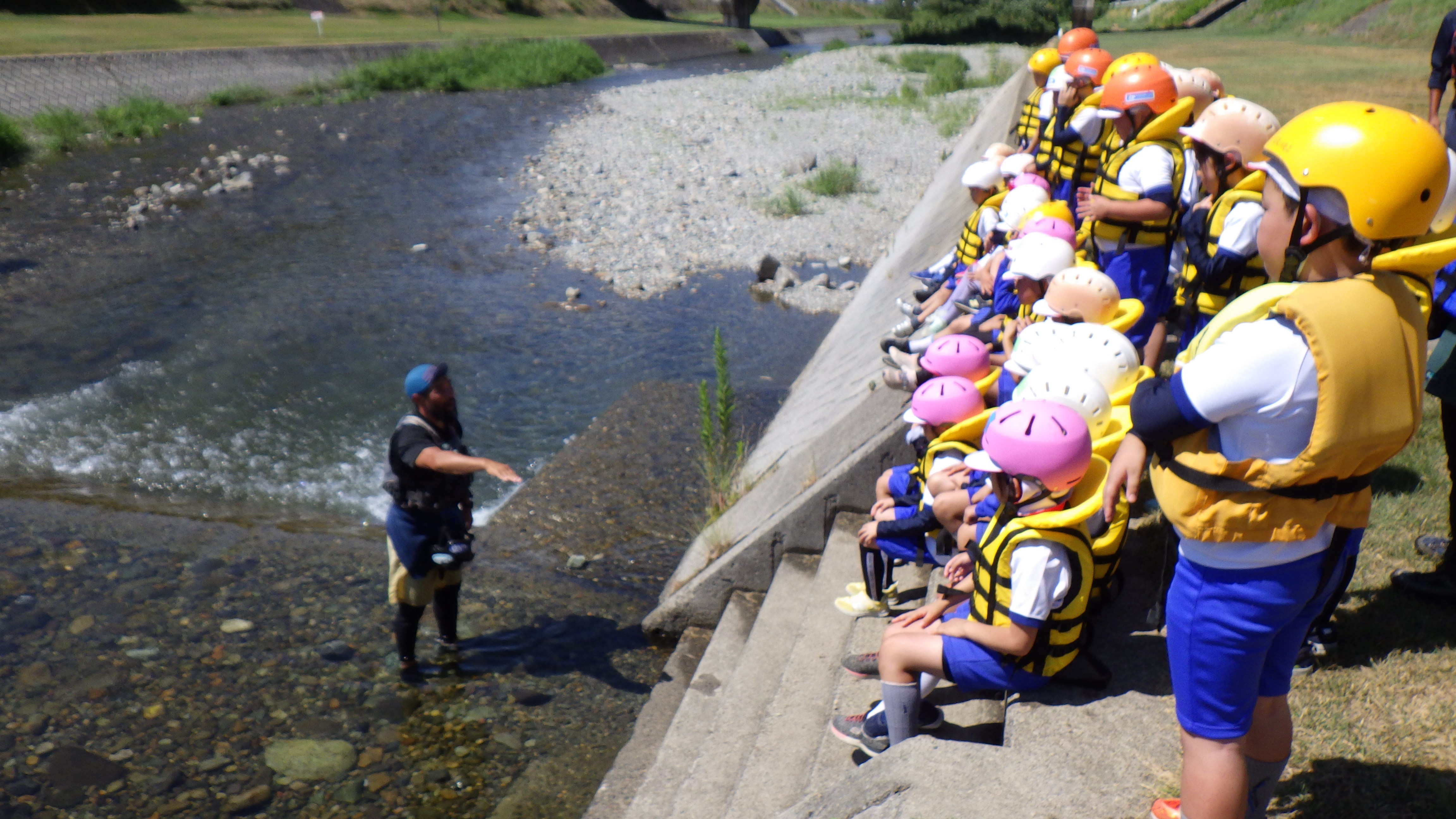ライフジャケットとヘルメットをかぶり、川で泳ぐ体験をしました。仰向けになりながらも、顔は上げ前方を見ながら手でバランスをとるというなかなか難しい泳ぎとなりましたが、回を重ねる中で子ども達も段々と泳げるようになりました。 |