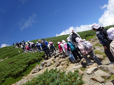 実施概要 | ・乗鞍自然保護センター見学 ・乗鞍観光センター~畳平バスターミナル間のバス内での講話 ・大黒岳登頂 ・富士見岳登頂 ・大雪渓付近の散策(下山) |