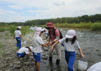 | 実施概要 | 学校近くの奈良井川の川辺の夏の生き物(水生・陸生) を観察したり、講師のお話を聞いたりすることを通して、川辺の夏の生き物 に 興味関心を高め、 自然 に親しむ。 ・川辺の生き物観察(水生)と川辺の生き物観察(陸生)の 採取と 観察 1時間 ・同定(生き物の名前等の確認)と記録 講師のお話(40分) |
