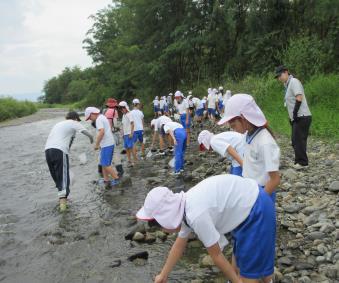 | 実施概要 | 学校近くの奈良井川の川辺の夏の生き物(水生・陸生) を観察したり、講師のお話を聞いたりすることを通して、川辺の夏の生き物 に 興味関心を高め、 自然 に親しむ。 ・川辺の生き物観察(水生)と川辺の生き物観察(陸生)の 採取と 観察 1時間 ・同定(生き物の名前等の確認)と記録 講師のお話(40分) |