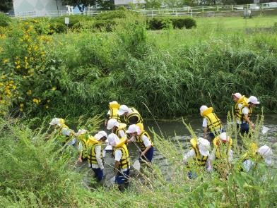 〈川の安全講習〉 川の流れについてやペットボトルを使った実験で、川の危険箇所を教えていただきました。 〈川の生き物さがし〉一人ひとり網を持ち、石をひっくり返したり、草むらを動かしたりして出てきた生き物を捕まえました。水生昆虫やエビなど、たくさんの種類の生き物を捕まえることができました。