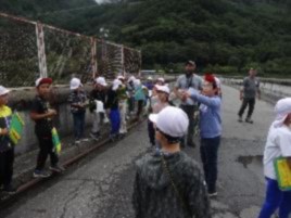 ○ダムの上を歩く 水殿ダムを上から見下ろし、その大きさに圧倒された子ども達。「水の上に浮いているものは何?」「どうしてこんなに水を溜めているの?」など気になることをガイドさんにどんどん質問し、ダムの果たす役割について理解を深めていた。