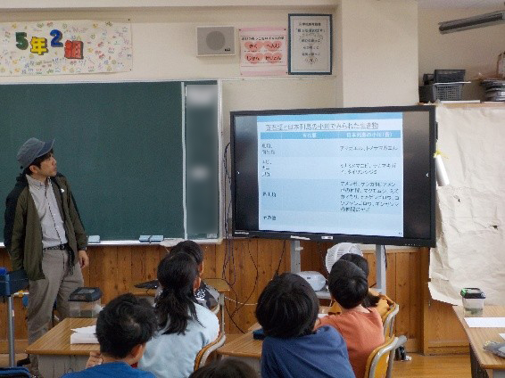 | 授業について | 1 授業を通しての子どもたちの反応、感想等 ・百石堰に多数の生物がいて、子どもたちは楽しく学習できた。 ・百石堰の生物調査を通して日本列島の小川の良さや課題が見えた。 ・学校ビオトープとは何か、どんな生き物の住む環境を目指すか考える貴重な機会となった。 ・放課後、「また美馬さんと生き物調査したい」とつぶやいていた。2 先生方の感想、要望等 ・学級担任ではなく、専門家である美馬さんを講師に迎えたことで、より多くの生物を調査することができた。また、その生物の特徴もレクチャーしていただいたことで、子どもたちの理解や関心が深まった。さらに、実地調査後のふりかえりの時間に、美馬さんがパワーポイント資料で、日本列島の小川と百石堰の違いを子どもたちに問いかけたり、学校ビオトープとはなにかを問いかけたりしたことで、子どもたちが学習材としている学校ビオトープを、これからどうしていけばよいのかと考えるうえでの契機となった。 |