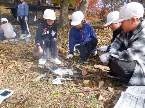 木に登る、より高いところへ ![]() まず、小池さんからツリークライミングのやり方をレクチャー ①膝で伸びあがったら、手の前にあるロープを少し上に引き上げてそのロープより上をつかむ ②おしりを下ろしてしまって、足かけロープも手元まで引き上げる 膝で伸びあがる を繰り返してだんだん上がっていく ③数回おきに落下止めの結び目を作りながら登る ※下に入らないことやヘルメットについても確認 予定時間より設営に手間取り30分ほど遅れてスタート 待ち時間は、たき火で過ごす。たき火のやり方を教えてあったが、上手にスムーズに火をつけられたグループが多かった。参観日でもあったのでおうちの方も朝から一緒にたき火を囲む。国語で考え合った「自分たちのおすすめの遊び方や木登りについて」も発表した。待ち時間は長かったもののたき火でマシュマロを焼いたり、沸かしたお湯でミルクコーヒーを飲んだりして思い思いに秋の山を満喫。 14:20の限界までになんとか18名。もっと挑戦したい子もたくさん見られた。ロープクライミングの面白さと難しさを感じることができた。 |