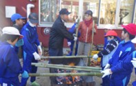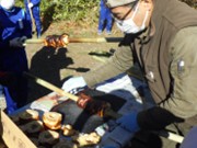 ・年輪の状態によって、年輪が形成された時の環境を知ることができることなどをご指導いただいた。また、森林の成長や間引きの仕方について児童が整列して体験的に学んだ。 ・水を蓄える、土砂災害などを防止する、地球温暖化を防ぐ、二酸化炭素を吸収する、などの観点から森林の必要性について学び、これからの森林との関わり方について考えた。 ② 実習(年輪に見立てたバウムクーヘン作り) ・生地を竹の中央にかけ、ペアで竹の両端を持った。コンロを挟み込む位置に移動して、生地が落ちないように竹を回しながら加熱した。焼き色がついてきたら新たに生地を一層重ね、加熱する工程をくり返した。各ペアが7歳(7層)の年輪になるまで焼き上げた。 ・完成したバウムクーヘンは、両端を切って回転させながら竹から外した。切り分けると断面には年輪が出来ていることを確認した。切れ端は試食し、残りは持ち帰った。 |