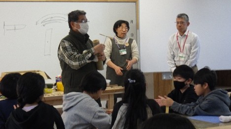 | 1 授業を通しての子どもたちの反応、感想等 ・小刀で削るのが難しかった。 ・手がすごく痛くなったけれど、やっていて楽しかった。 ・羽がだんだん斜めに出来上がっていくのが嬉しくなって、どんどん削っていったら、角度がついてきたのでもっとやりたくなった。早く飛ばしてみたい。 2 先生方の感想、要望等 |